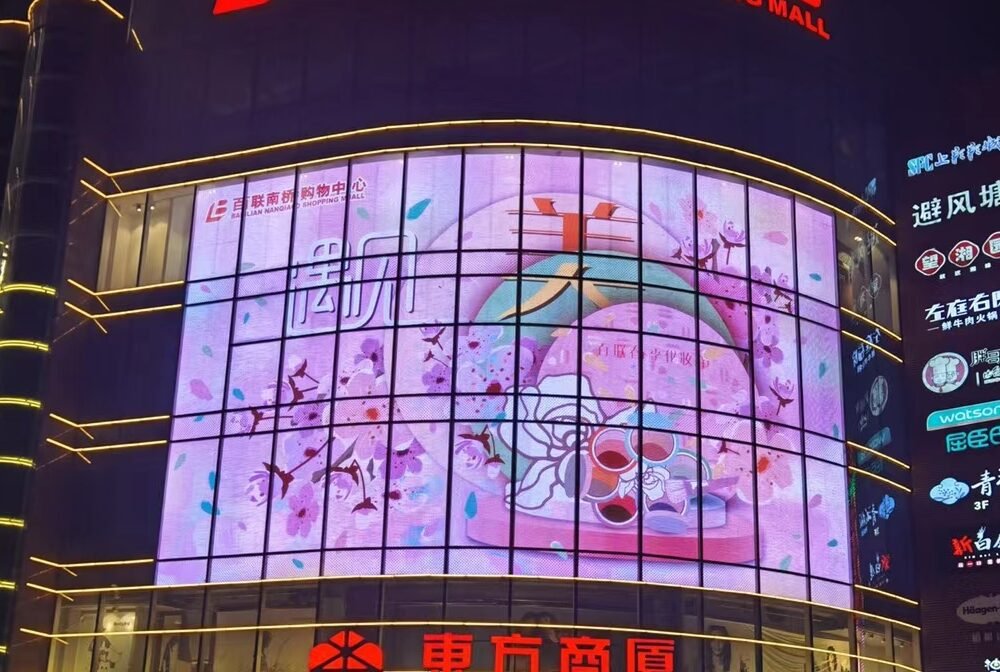 Our ice screen adapts to any environment: 2,000 nits for indoor retail windows, 3,500 nits for atriums, or 5,000 nits for full sun-exposed building facades. Brightness is calibrated per project specifications.